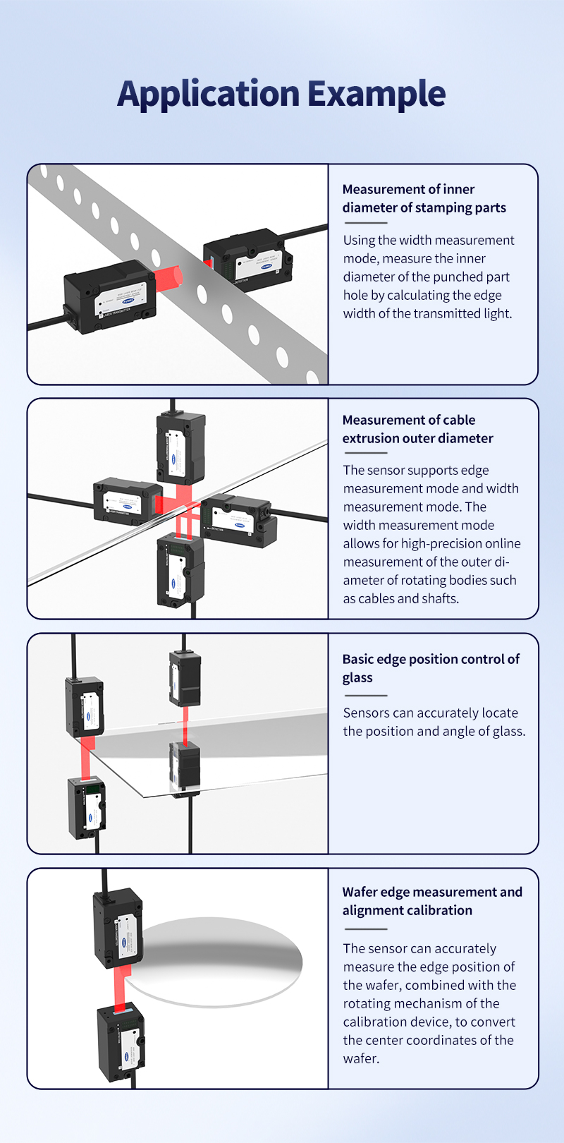ওয়েফার এজ পজিশনিং এবং উইন্ডিং ডেস্কিউ: সেমিকন্ডাক্টর ম্যানুফ্যাকচারিংয়ের জন্য, সেন্সরটির ক্ষুদ্রতর নকশাটি সরু জায়গাগুলিতে এম্বেড করা যেতে পারে এবং 14*12 মিমি স্পটটি সঠিকভাবে ওয়েফার কনট্যুরকে চিহ্নিত করে।