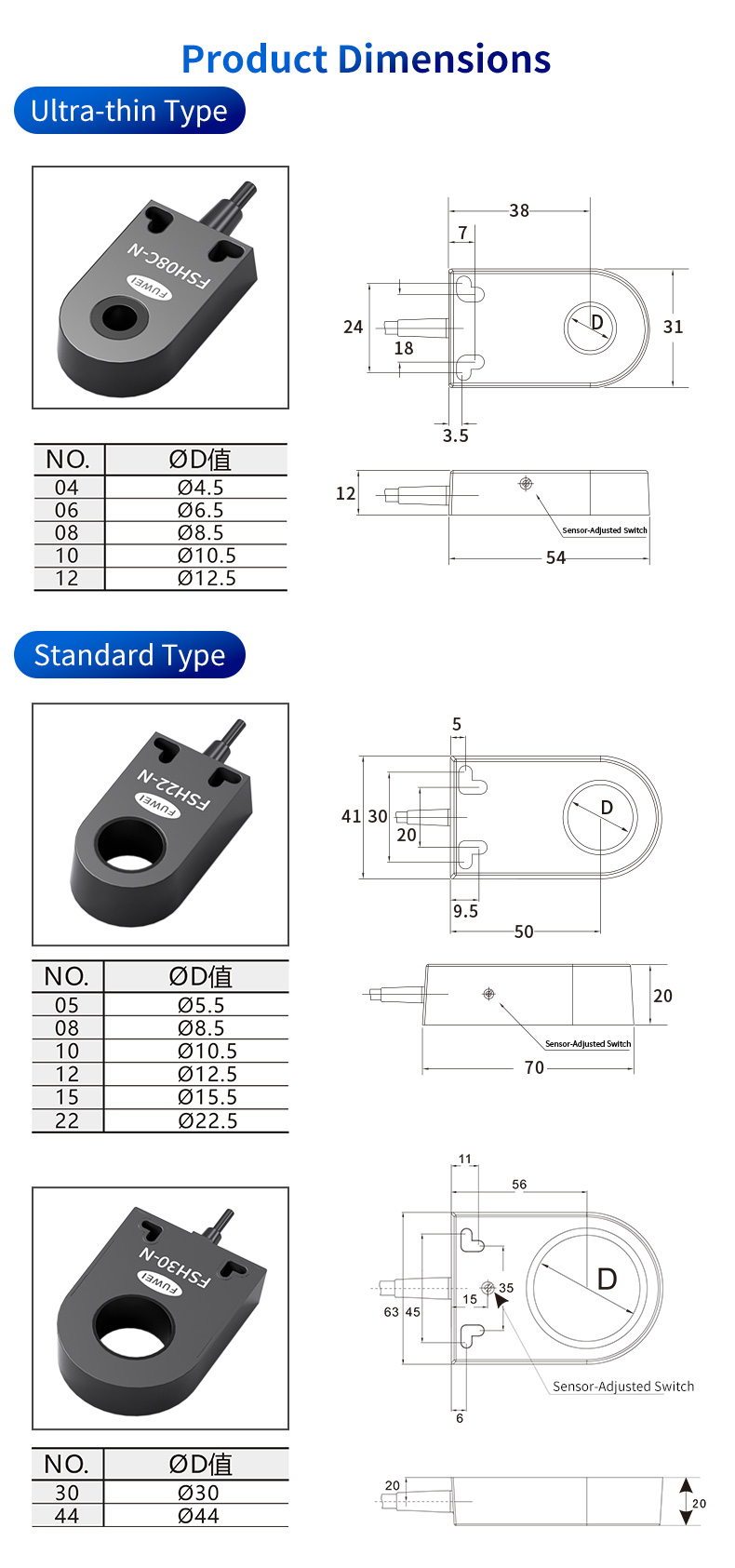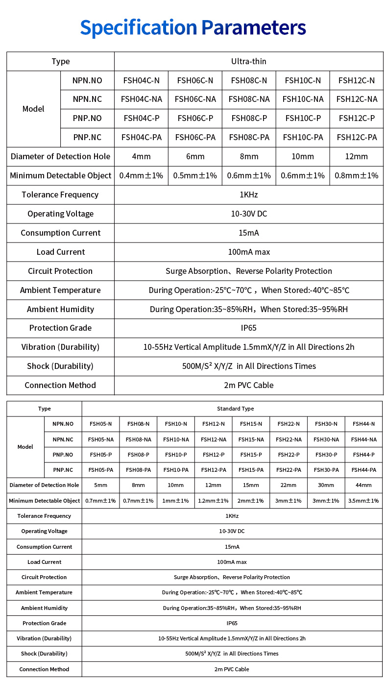 প্রতিটি অ্যাপ্লিকেশনের জন্য একটি সেন্সর আমরা বুঝতে পারি যে কোনও দুটি অটোমেশন সেটআপ অভিন্ন নয়৷ এই কারণেই FSH05-FSH44 সিরিজ দুটি স্বতন্ত্র ফর্ম ফ্যাক্টর এবং একাধিক অ্যাপারচার আকারে উপলব্ধ। আল্ট্রা-থিন টাইপ: স্থান-সীমাবদ্ধ পরিবেশের জন্য আদর্শ যেখানে মাউন্টিং রিয়েল এস্টেট সীমিত। এর স্লিম প্রোফাইল সনাক্তকরণ কর্মক্ষমতার সাথে আপস না করে আঁটসাঁট মেশিনে ইনস্টলেশনের অনুমতি দেয়। স্ট্যান্ডার্ড টাইপ: সাধারণ-উদ্দেশ্য অ্যাপ্লিকেশনগুলির জন্য শক্তিশালী কর্মক্ষমতা অফার করে, একটি বলিষ্ঠ এবং নির্ভরযোগ্য সেন্সিং সমাধান প্রদান করে।